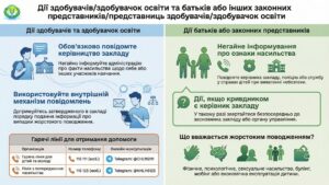 Передбачено також зобов’язання закладів освіти забезпечувати на своїх веб-сайтах відкритий доступ до правил поведінки здобувача освіти в закладі освіти, плану заходів, спрямованих на запобігання та протидію булінгу, порядку подання та розгляду заяв (з дотриманням конфіденційності) про випадки булінгу від здобувачів освіти, їх батьків. Педагогічні працівники: