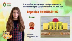 Вітаємо ученицю 6-А класу Николайчук Вероніку з перемогою (ІІІ місце) у ІІ етапі обласного конкурсу з образотворчого мистецтва серед здобувачів освіти закладів загальної середньої освіти та позашкільної освіти в номінації “Фрагменти архітектури” (наказ управління освіти Калуської міської ради від 13.02.2026 №36).