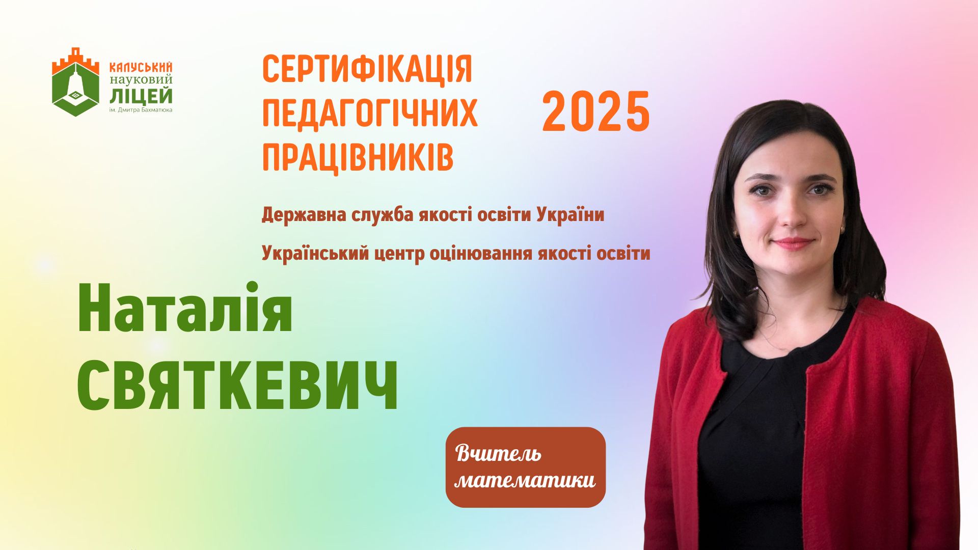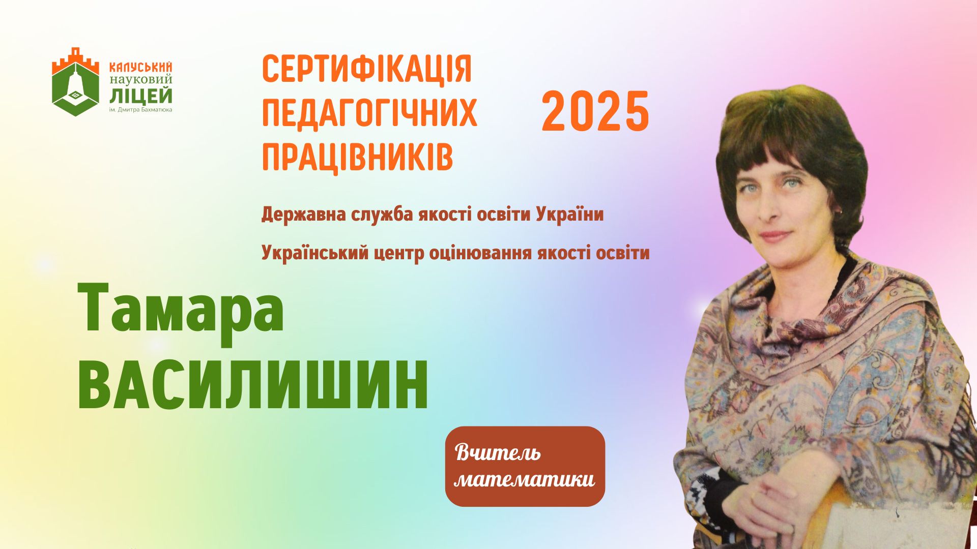 Вітаємо наших учителів математики Василишин Тамару Богданівну і Святкевич Наталію Володимирівну з успішним проходженням сертифікації педагогічних працівників у 2025 році. У процесі сертифікації педагоги результативно виконали незалежне тестування, обʼєктивно здійснили самооцінювання, на належному рівні продемонстрували свій практичний досвід (провели по два відкриті уроки із самоаналізом, презентували власну систему роботи і досягнення за два останні роки), дали професійне інтервʼю та отримали високі оцінки незалежних експертів.