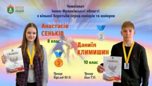 Вітаємо з перемогою в чемпіонаті Івано-Франківської області з вільної боротьби серед юніорів та юніорок (U-17) учня 10-В класу Даниїла Климишина (ІІ місце, срібна медаль) та ученицю 8-Б класу Анастасію Сеньків (ІІІ місце, бронзова медаль)!