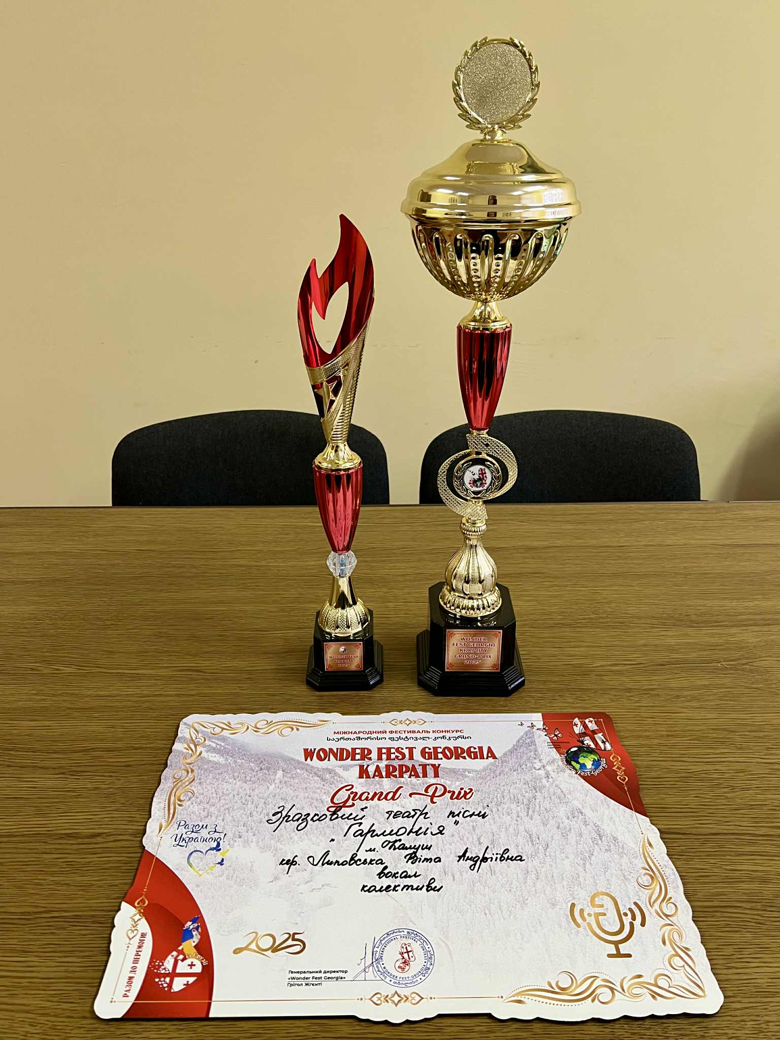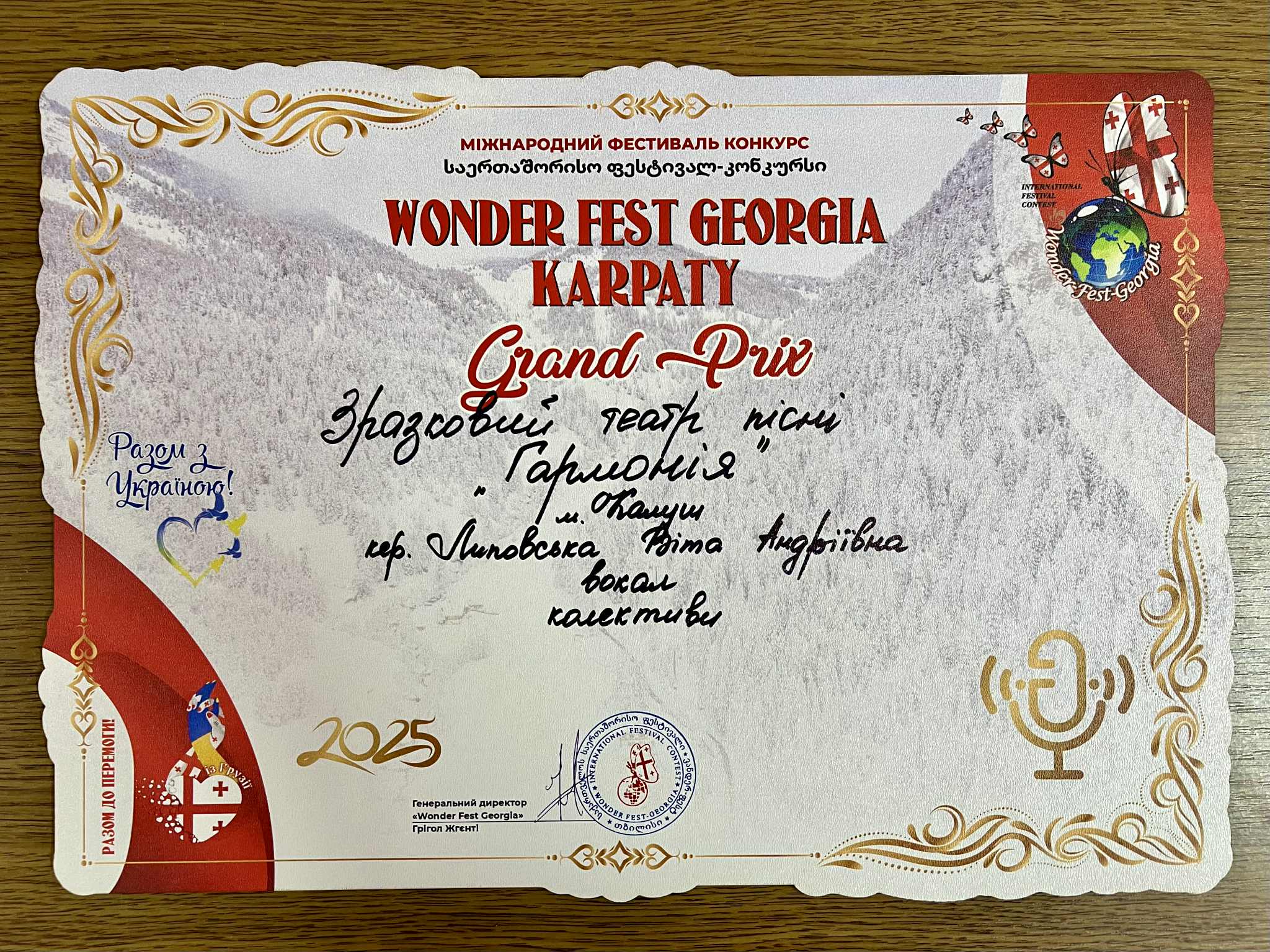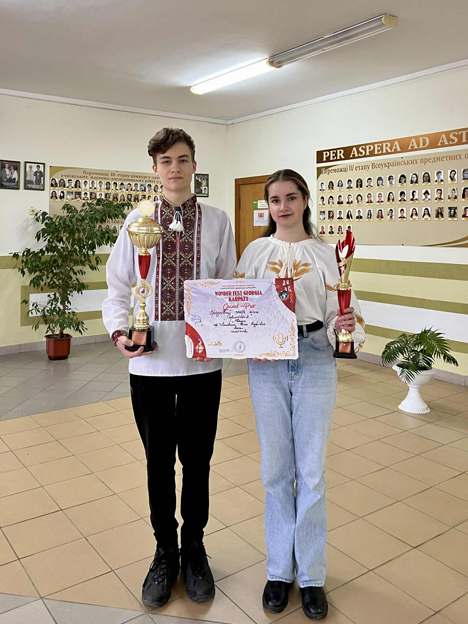Вітаємо учнів ліцею Паньків Ірину (11-А) та Фурмана Максима (10-А), які у складі Зразкового театру пісні “Гармонія” (керівник Віталіна Липовська) отримали Гран-прі Міжнародного фестивалю-конкурсу WONDER FEST GEORGIA KARPATY!