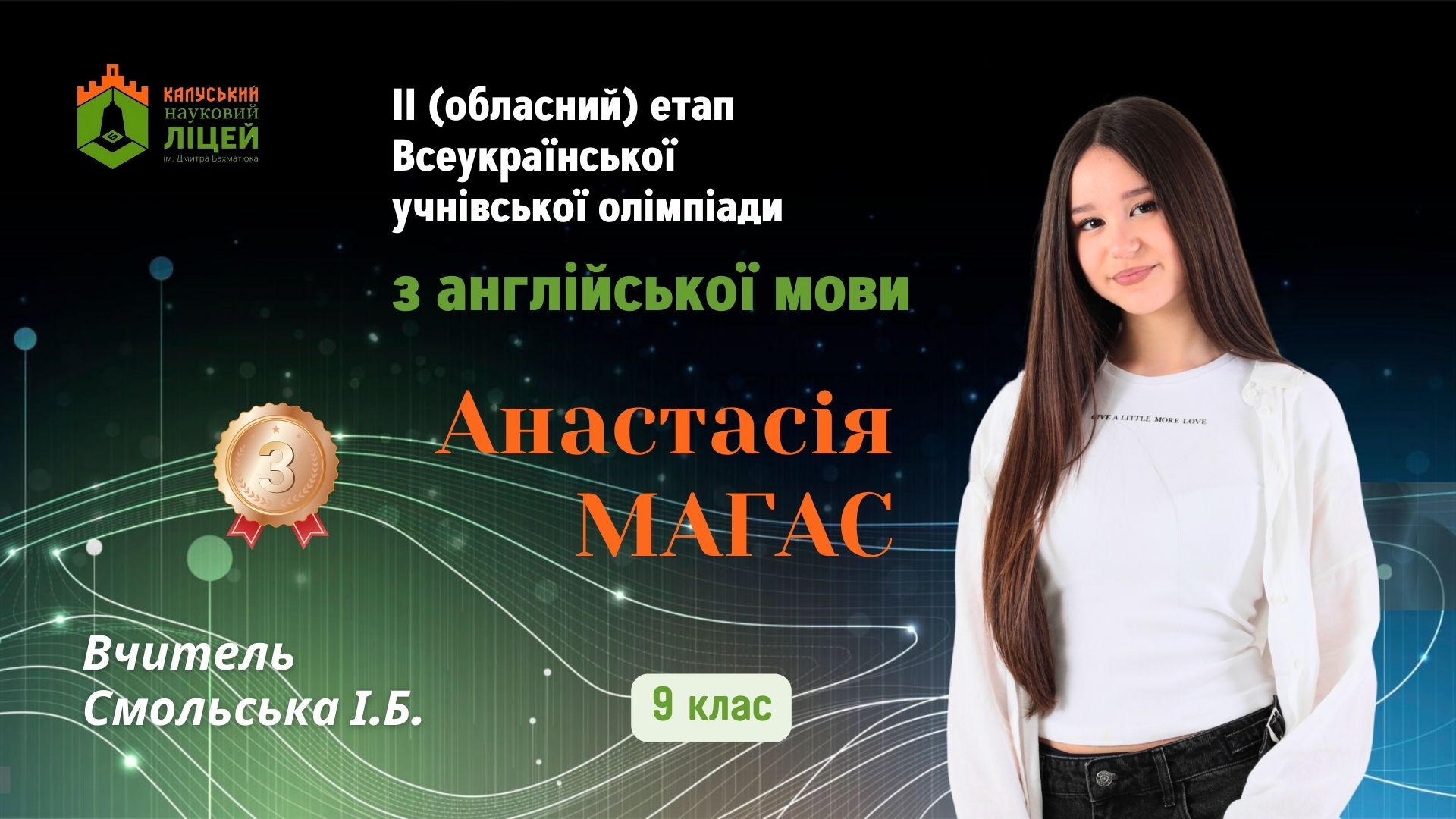 | 17 | Магас Анастасія | 9 | Англійська мова | Смольська І.Б. | ІІІ |