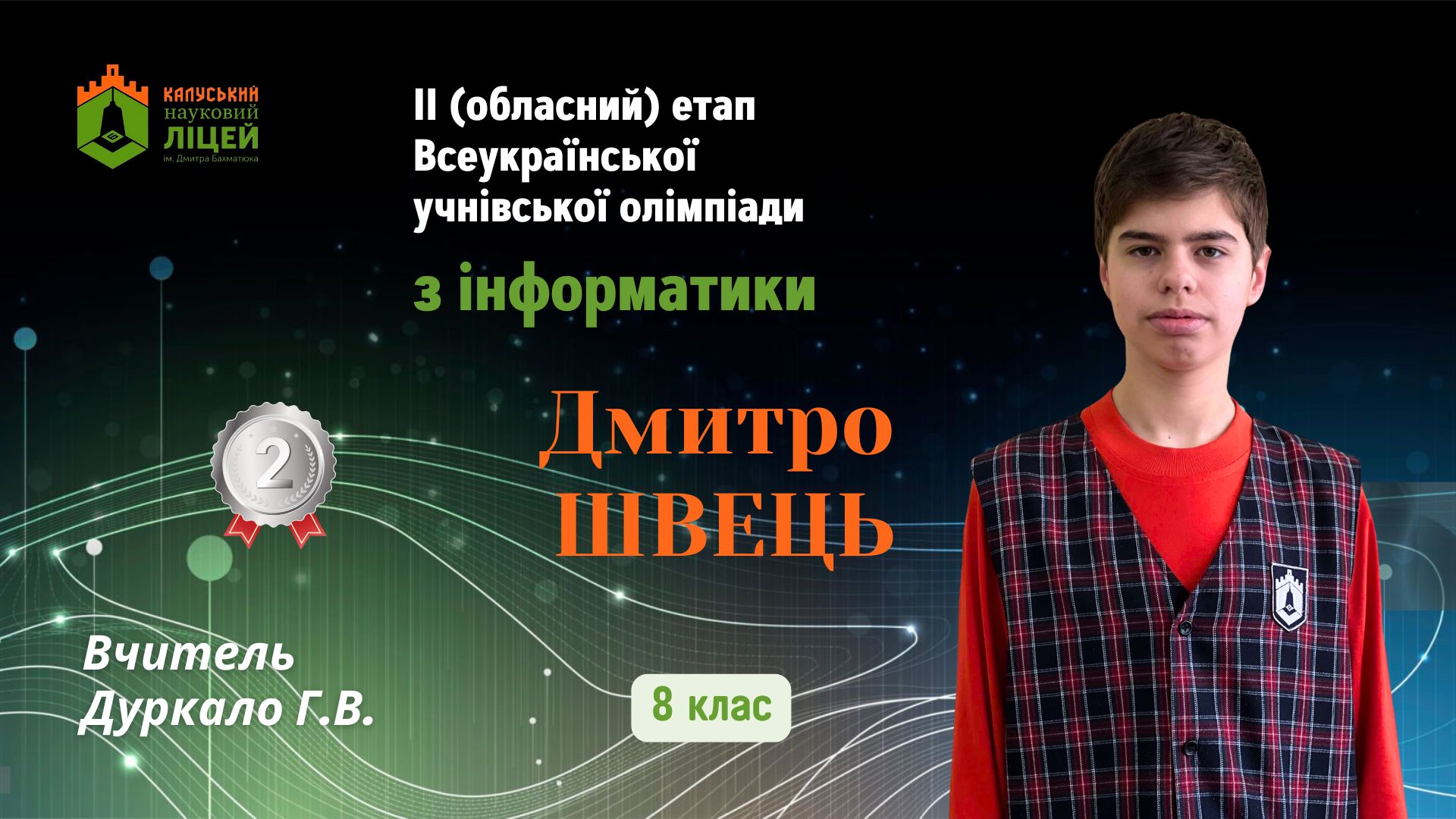 | 10 | Швець Дмитро | 8 | Інформатика | Дуркало Г.В. | ІІ |