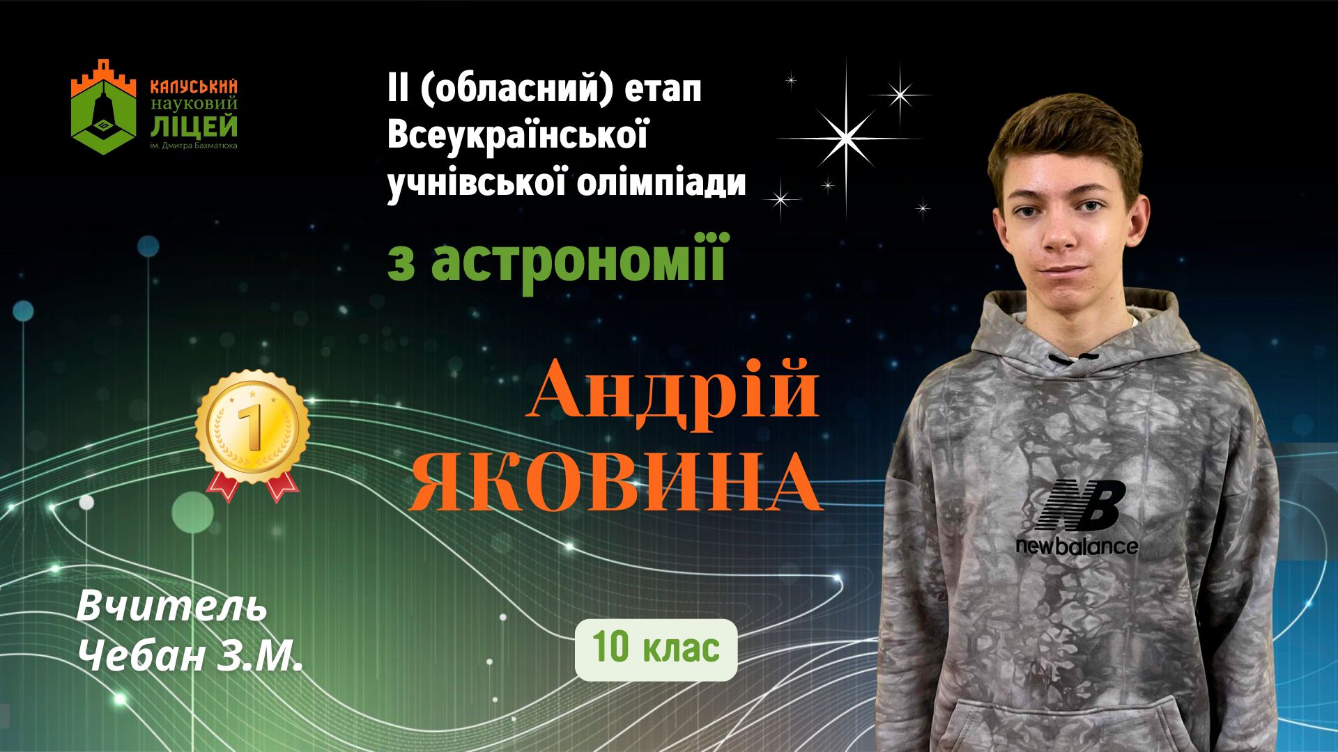 Яковина Андрій (10 клас) отримав 4 переможні результати — І місце з біології, І місце з астрономії, ІІ місце з хімії, ІІ місце з фізики.