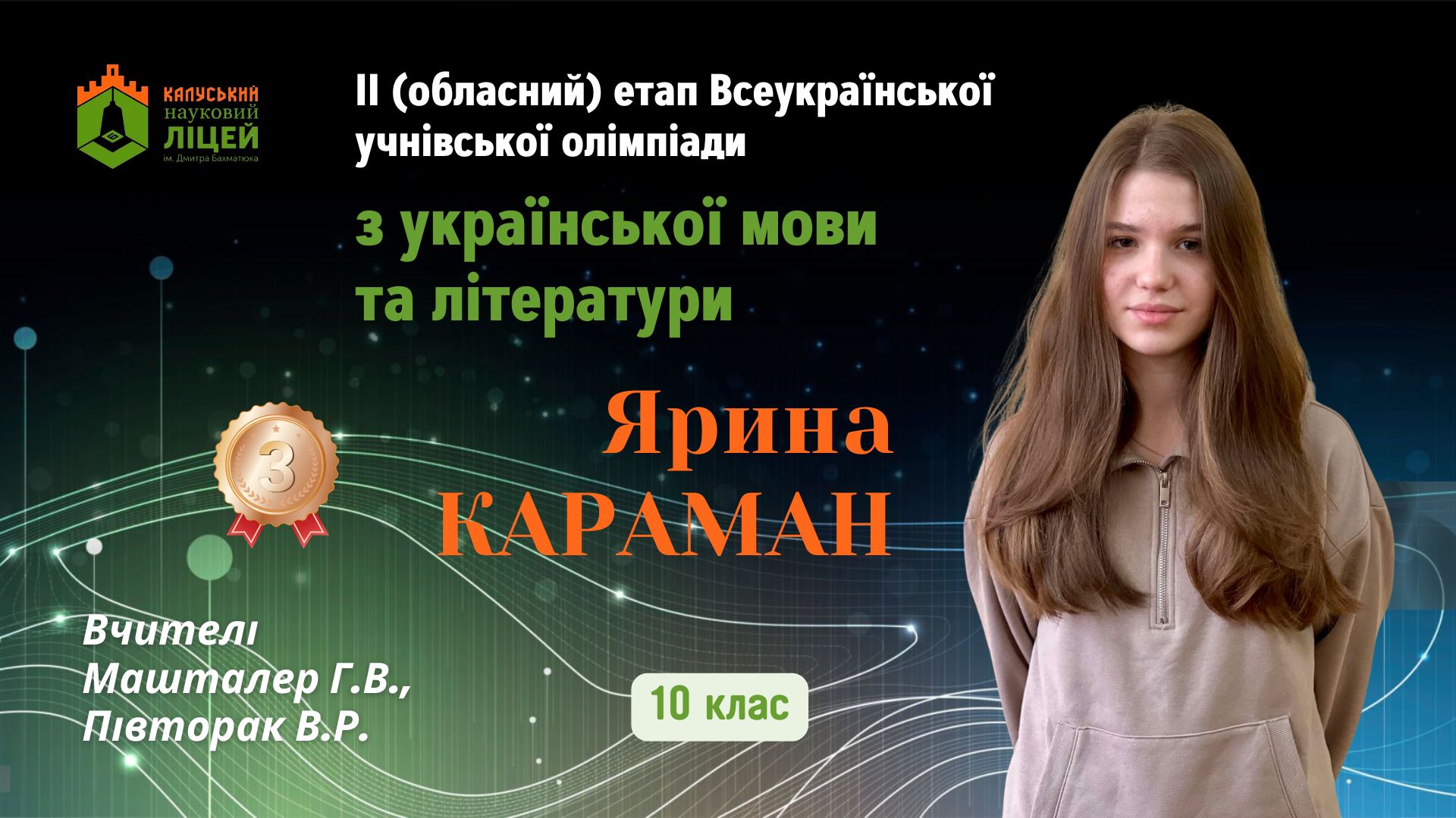 | 19 | Караман Ярина | 10 | Українська мова і література | Машталер Г.В.,
