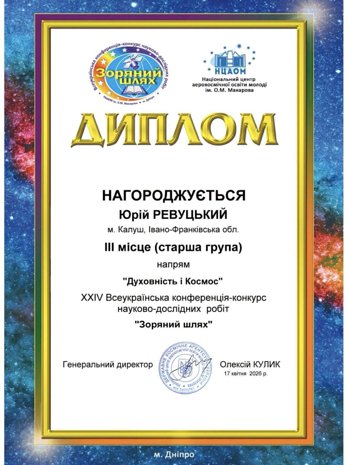 Вітаємо учня 11-Б класу Ревуцького Юрія та його наукового керівника Сербін Ольгу Василівну з переможною участю (ІІІ місце) у XXІV Всеукраїнській конференції-конкурсі науково-дослідних робіт «Зоряний шлях», що проводилася Національним центром аерокосмічної освіти молоді України ім. О. М. Макарова (Дніпро) 13-17.04.2026 в онлайн-форматі.