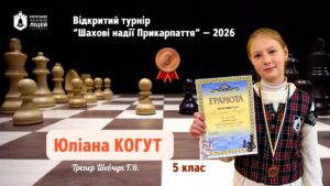 Вітаємо Когут Юліану, ученицю 5-А класу, з перемогою (ІІІ місце, бронзова медаль) у Відкритому турнірі “Шахові надії Прикарпаття” — 2026, який 01.02.2026 відбувся в Івано-Франківську.