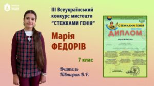 Вітаємо Федорів Марію (7-А) з перемогою (Перша премія) у ІІІ Всеукраїнському конкурсі мистецтв “СТЕЖКАМИ ГЕНІЯ”, що проводився Центром культурних та освітніх програм до Дня народження Тараса Шевченка (вчитель Півторак В.Р.).