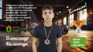 Вітаємо Олександра Каменчука, учня 9 класу, з перемогою (2 місце, срібна медаль) у Відкритому всеукраїнському чемпіонаті ГО “Всеукраїнське фізкультурно-спортивне товариство “Колос” із важкої атлетики серед юнаків та дівчат віком до 15 років, який 31.07.2025-02.08.2025 проходив у Коломиї.