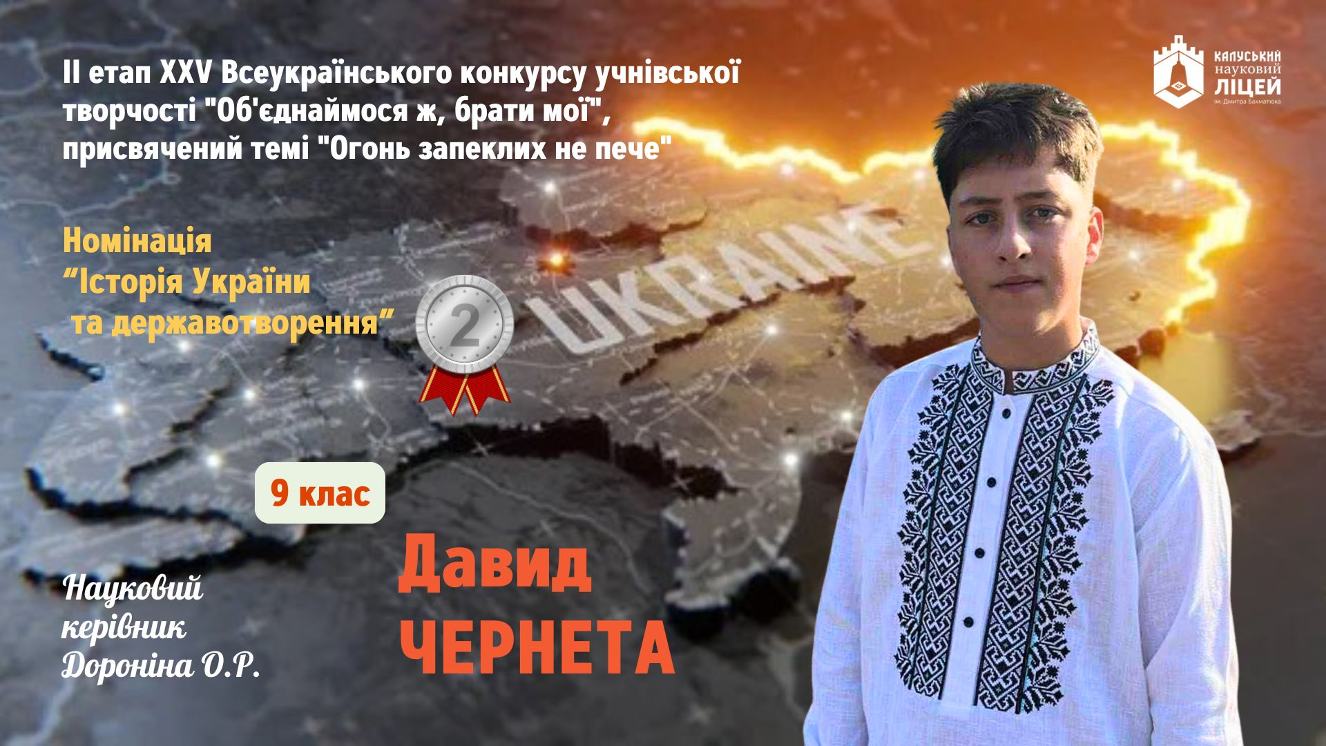 У номінації “Історія України та державотворення” ІІ місце здобув Чернета Давид, учень 9 класу. Науковий керівник — Дороніна Ольга Романівна, вчитель історії.