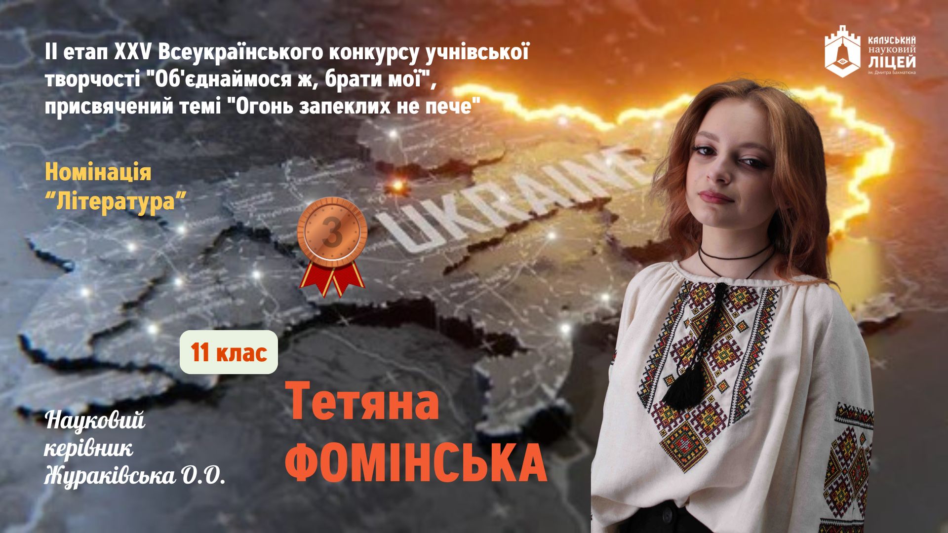 У номінації “Література” ІІІ місце здобула Фомінська Тетяна, учениця 11 класу. Науковий керівник — Жураківська Олеся Олександрівна, вчитель української літератури.