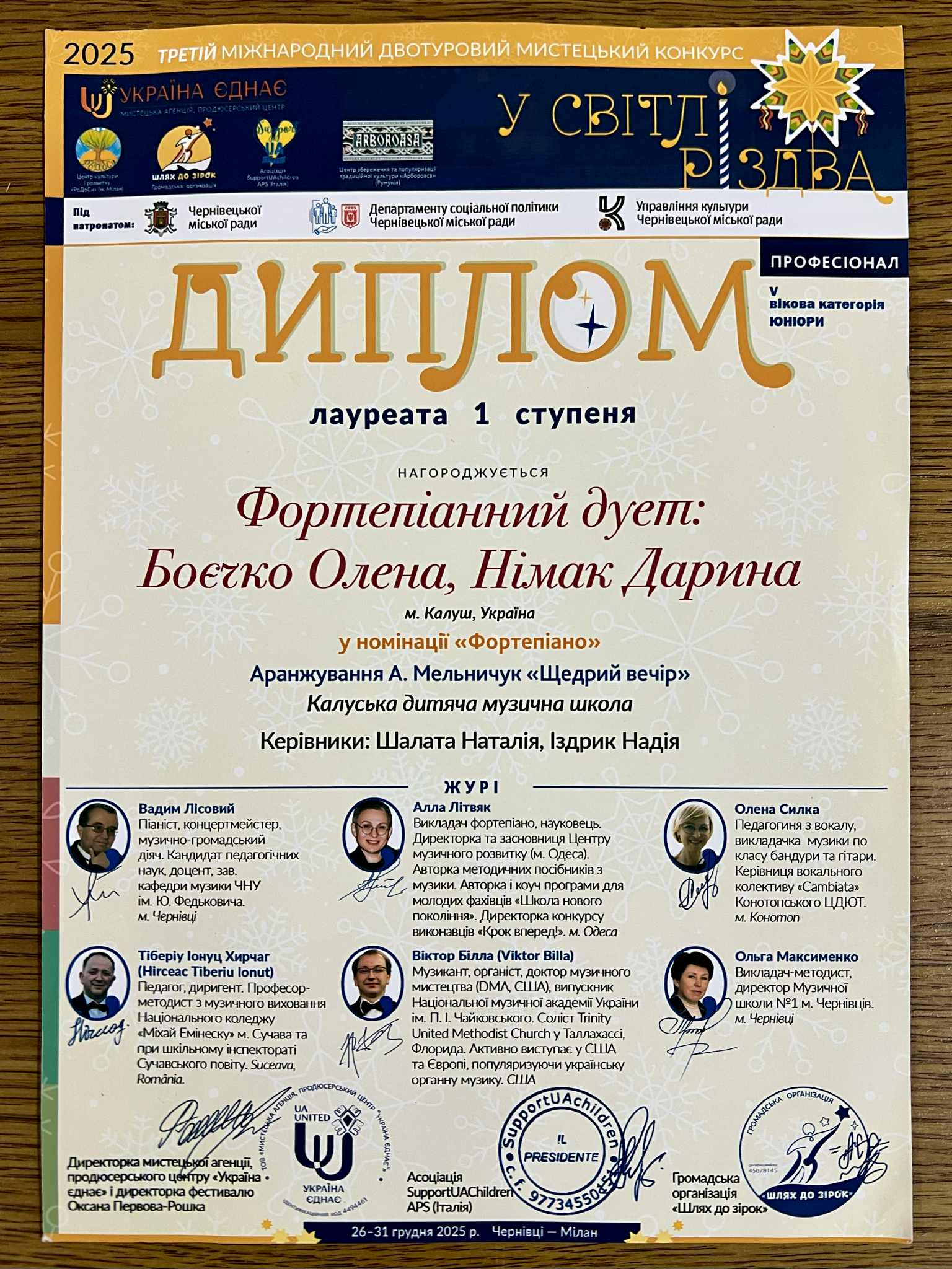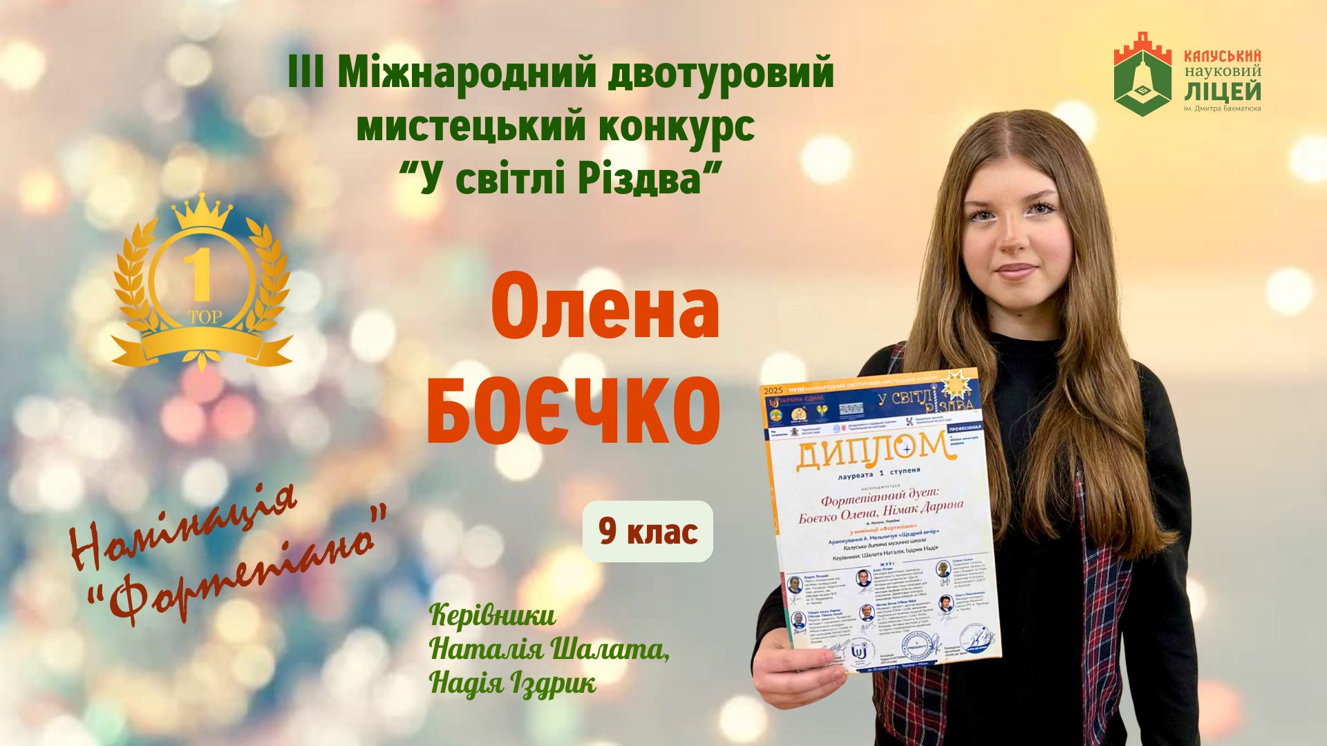 Вітаємо ученицю 9-Б класу Олену Боєчко з перемогою (І місцем) у ІІІ Міжнародному двотуровому мистецькому конкурсі “У світлі Різдва” (у складі фортепіанного дуету з ученицею Калуського ліцею №5 Дариною Німак).
