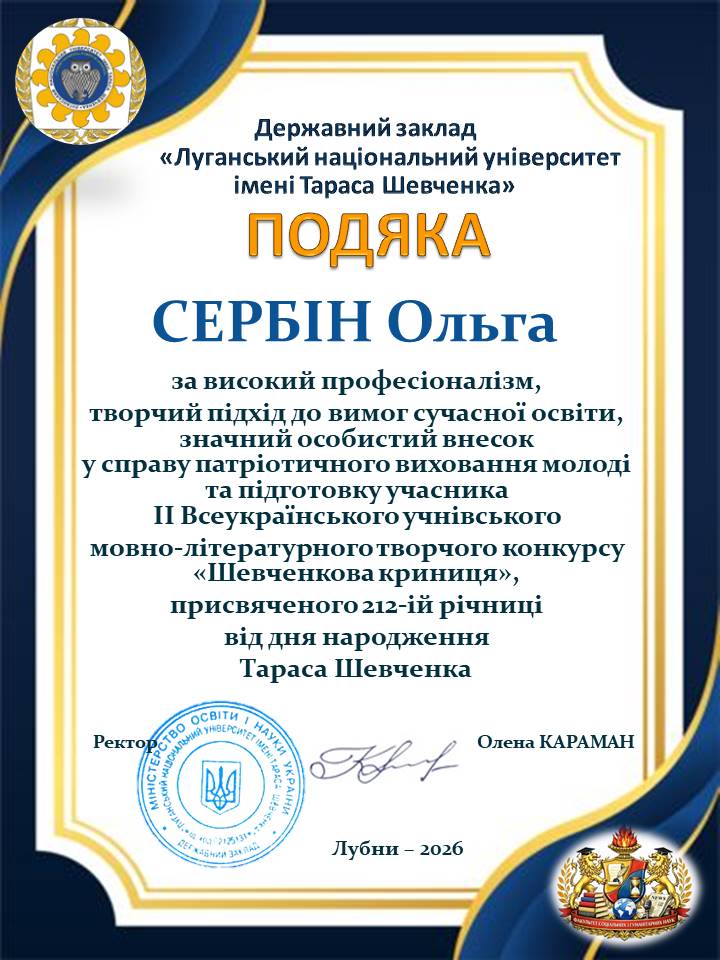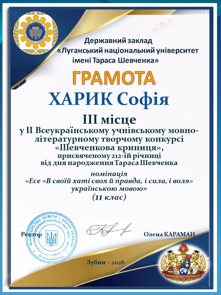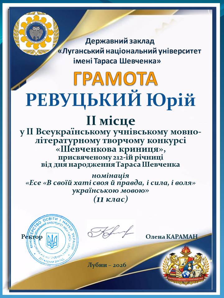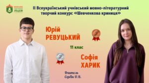 Вітаємо учнів 11-Б класу Юрія Ревуцького та Софію Харик з переможними результатами участі у ІІ Всеукраїнському учнівському мовно-літературному творчому конкурсі «Шевченкова криниця», присвяченому 212 річниці від дня народження Кобзаря, який відбувся на базі факультету соціальних і гуманітарних наук ДЗ «Луганський національний університет імені Тараса Шевченка».