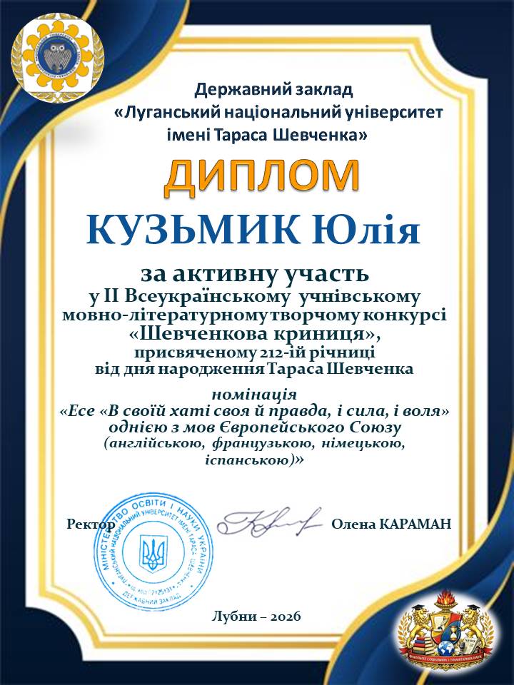 Ліцеїсти представили на конкурс есе “В своїй хаті своя й правда, і сила, і воля”. Учителем української мови і літератури конкурсантів-переможців є Сербін Ольга Василівна.